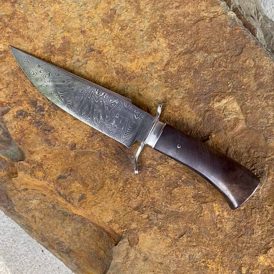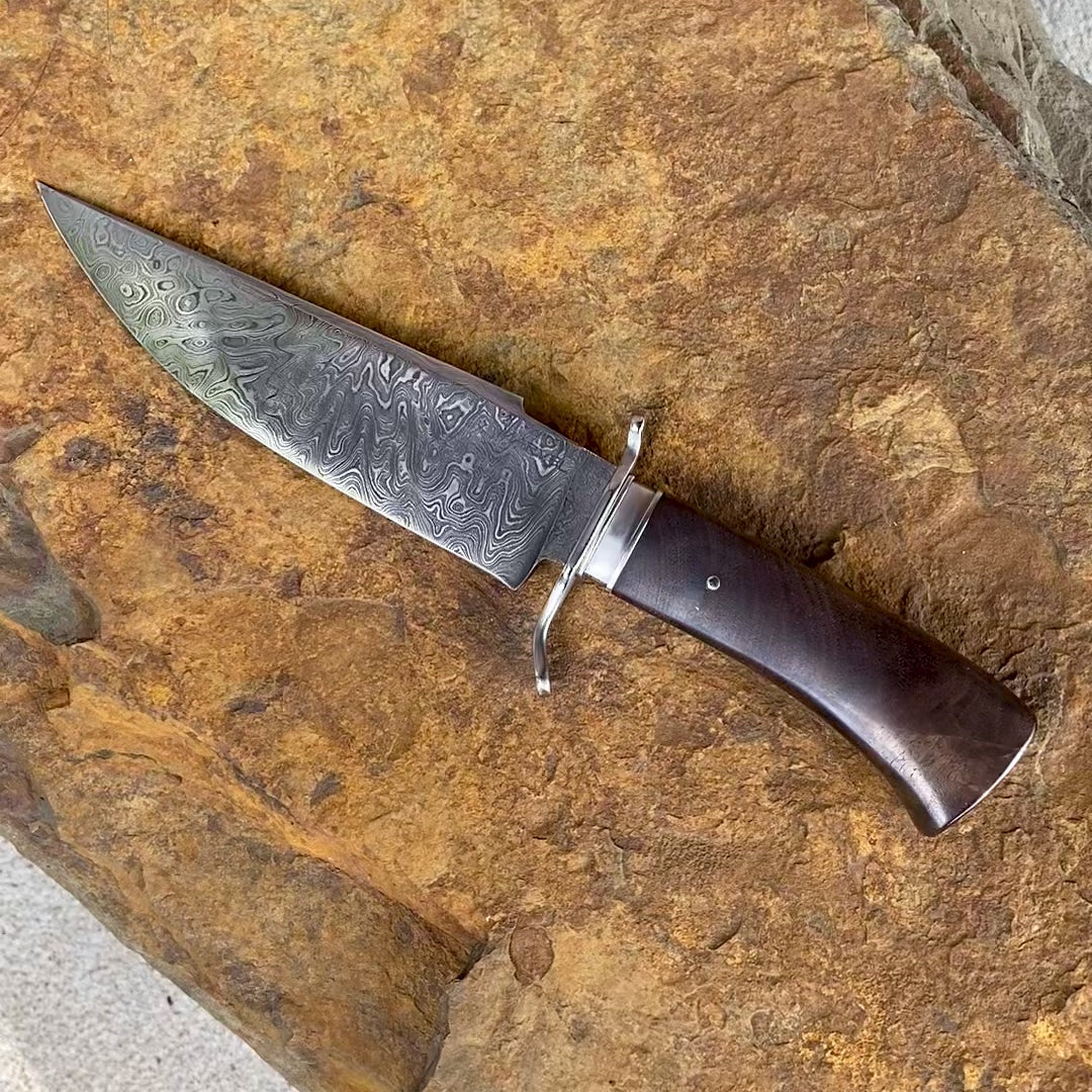 This Damascus Bowie is forged with 1084 and 15N20 steel with a swedged spine. The double guard is contructed of high carbon steel with a 3-piece collar. The handle is constructed from a piece of Walnut with a single domed pin. Hidden tang. 6 3/4 inch blade, 11 1/2 inches overall. 1084 and 15N20 Damascus high carbon steel. Forged.