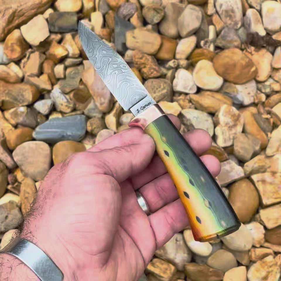 This Bird and Trout (B&T) hunting knife has a low layer count Damascus blade of 24 Layers of 1084 and 15N20 high carbon steel in a Tiger Trout pattern made by the maker. The blade measures 4 5/8 inches long, 15/16 inches wide, and 3/32 inch thick just before the guard with a gradual taper to the tip. The guard is 1/2 inch thick copper with stippling on the front and will develop a nice patina over time. The handle is constructed from G.L. Hansen Golden Trout G-Carta handle material. Over all the knife measures 9 1/8 inches long