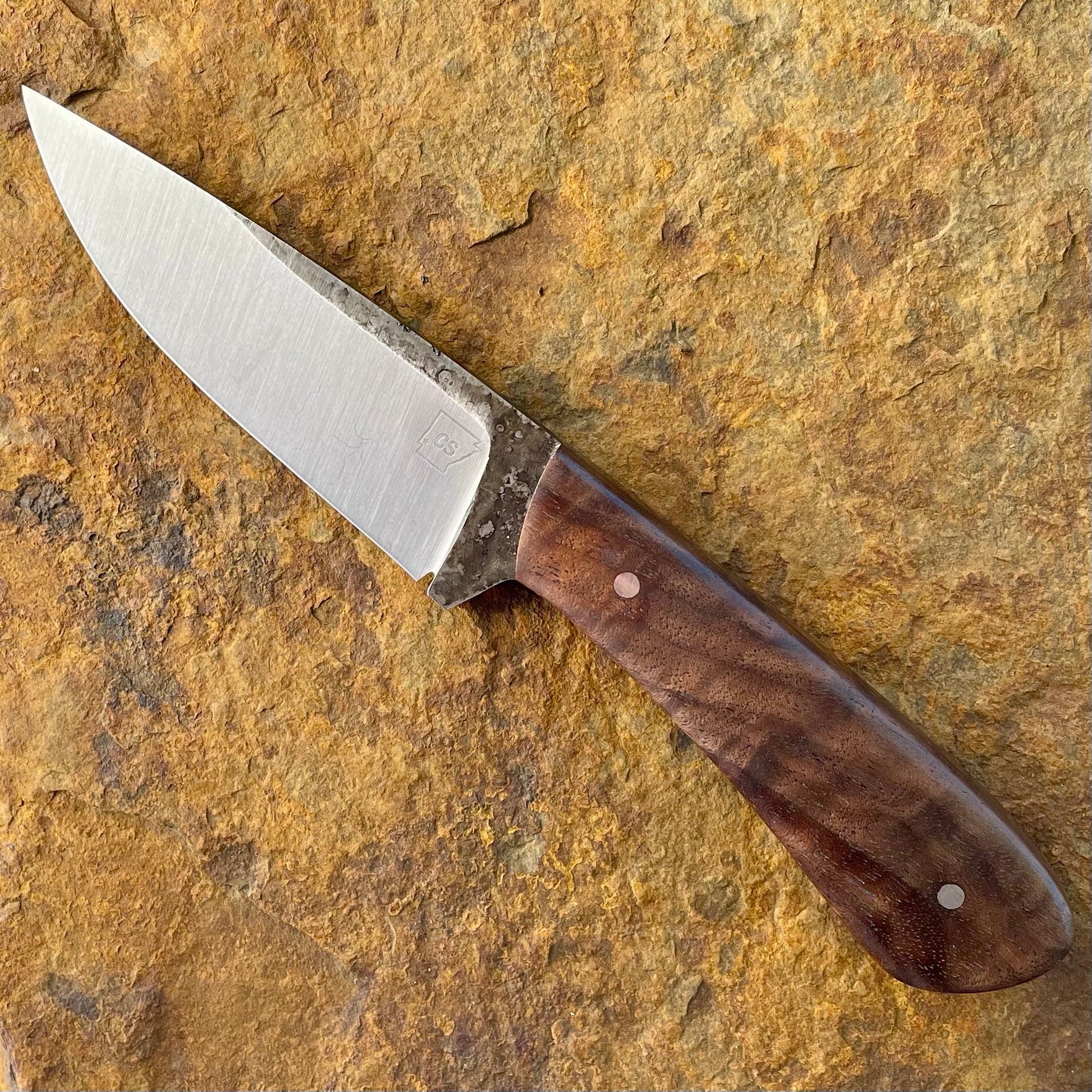 This Hunter is stock removal from 1080 high carbon steel with a flat ground drop point profile and 5/32 inch thick full tang construction blade. The handle is 9/16 inch thick and tapered and contoured to fit the hand nicely. The handle is assembled with Figured Walnut scales and two 1/8 inch pins. Full tang. 4 inch blade, 8 inches overall. 1080 high carbon. Stock removal.