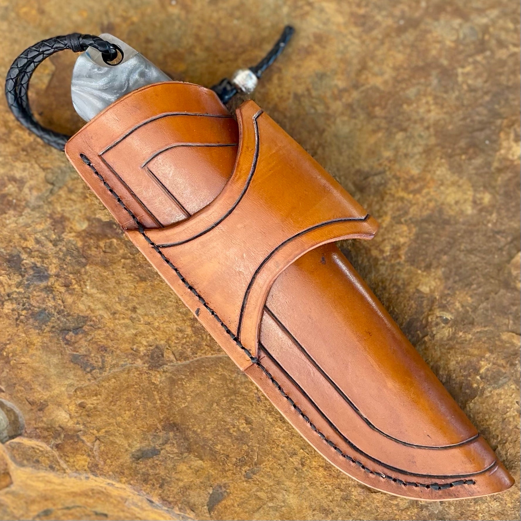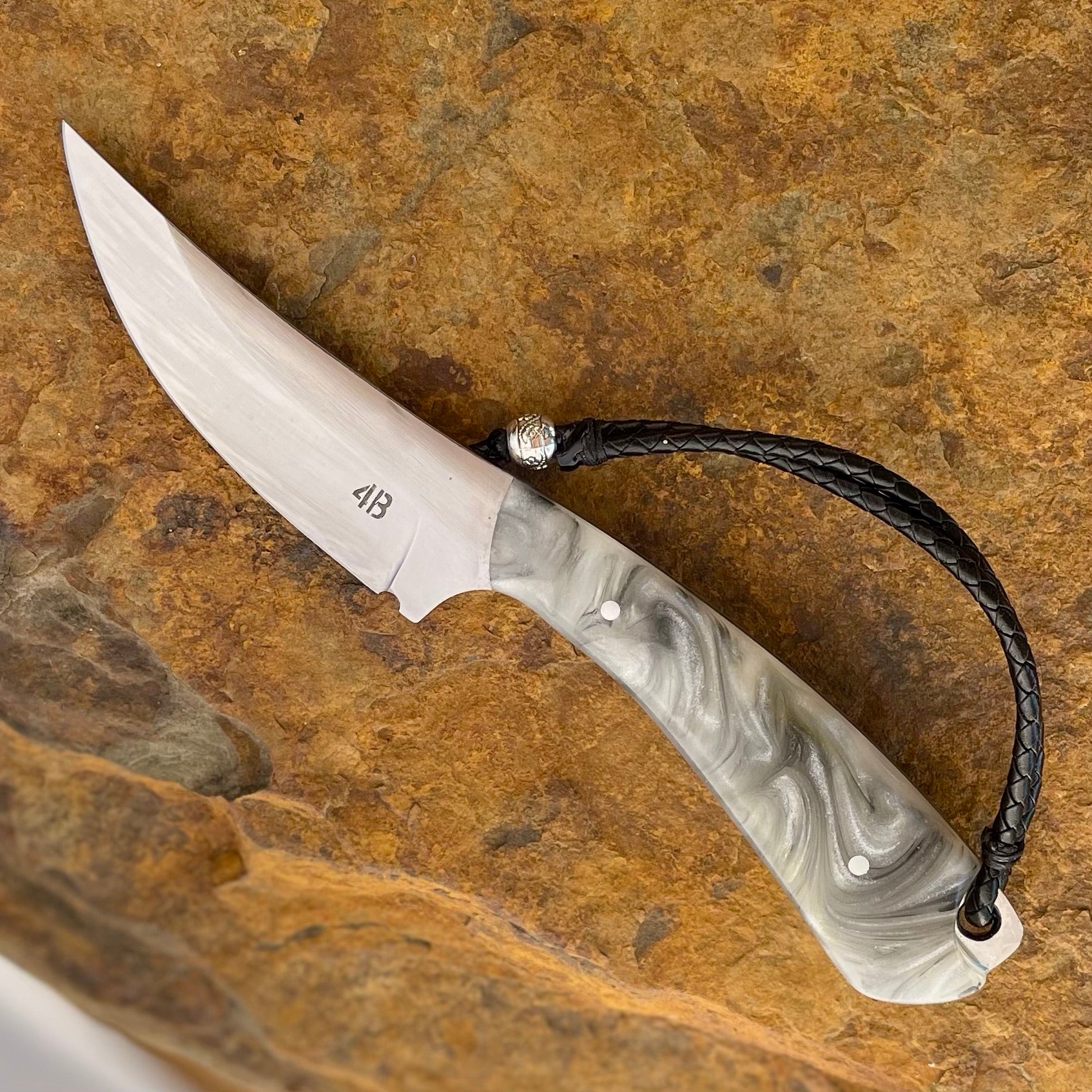 This Hunter/ Skinner with an up swept trailing point is stock removal from 1095 high carbon steel. It is hollow ground and full tang construction. The handle is shaped to fit in the hand comfortably and is assembled with Silver Swirl resin and 1/8 inch pins with a braided black leather lanyard with bead. Full tang. 3 3/4" inch blade, 8 1/4 inches overall. 1095 High Carbon. Stock Removal.