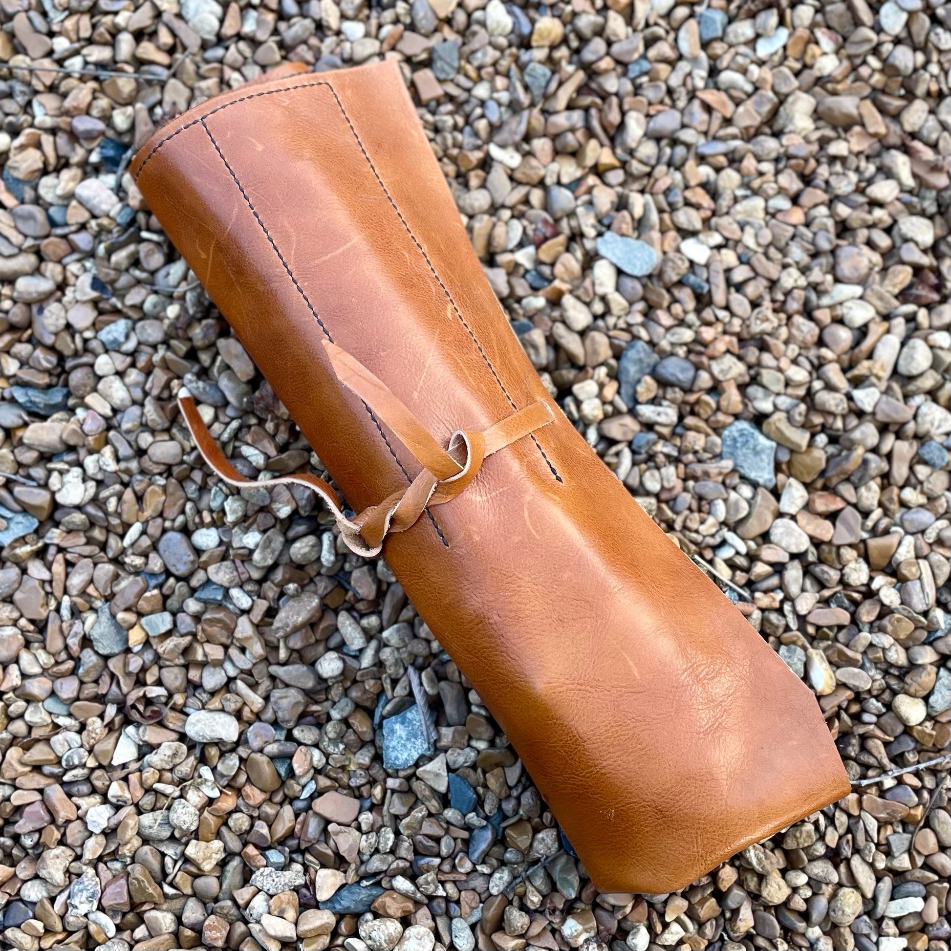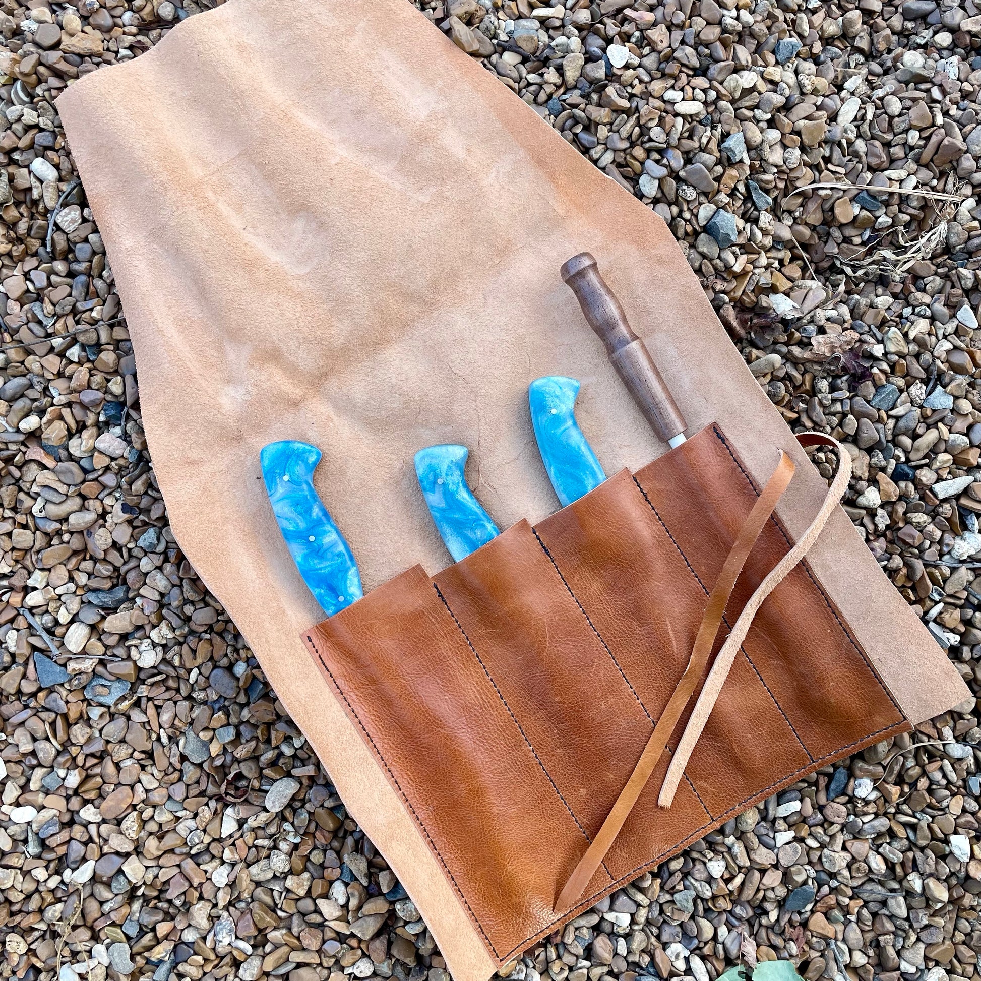 It comes with a leather knife roll made by the maker.