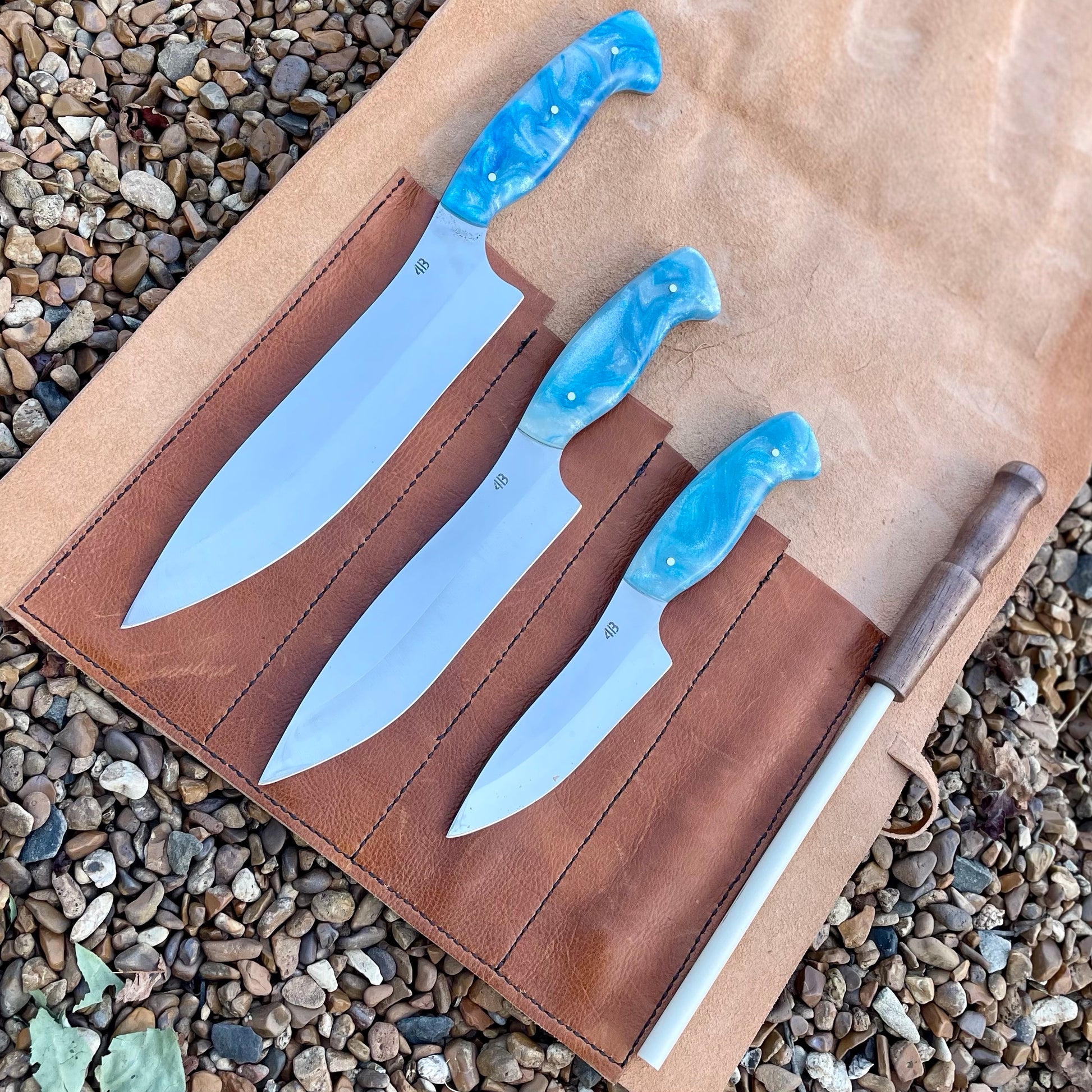 This Kitchen Knife set is stock removal from 1095 steel with a hollow grind, polished finish and full tang. The blades are offset from the handle to allow for clearance of the users knuckles while using over a flat surface. They are comfortable in the hand, lending themselves to be used with versatility in the kitchen. The measurements are - Large Knife: 1 11/16 inches wide, 8 inch blade and 12 5/8 inches overall. Medium knife: is 1 1/2 inches wide, 6 1/2 inch blade and 10 1/2 inches overall. Small knife: 1 1/4 inches wide, 4 5/8 inch blade and 8 5/8 inches overall All are 1/8" thick right in front of the handle. The handles are assembled with light blue and silver swirl resin scales. The set also includes a wooden handled ceramic honing rod to maintain a proper cutting edge. Full tang. 1095 steel. Stock removal.