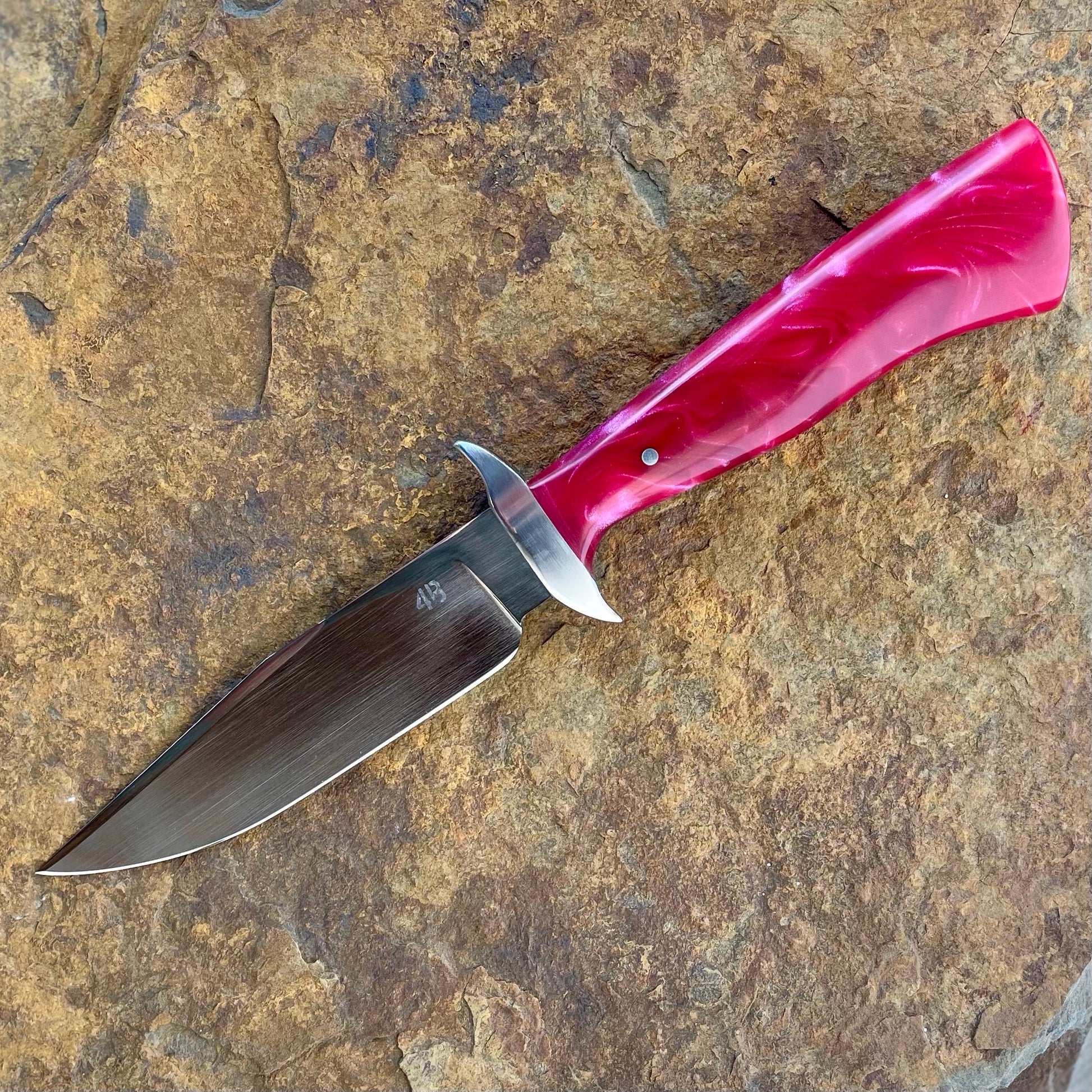 This Lady Bowie with a swedged clip point is stock removal from 1095 high carbon steel. It is flat ground and hidden tang construction. The handle is shaped to fit in the hand comfortably and is assembled with a stainless steel double guard and Pink Swirl resin and 1/16 inch pin. Hidden tang. 4 3/4 inch blade, 9 3/4 inches overall. 1095 High Carbon. Stock Removal.
