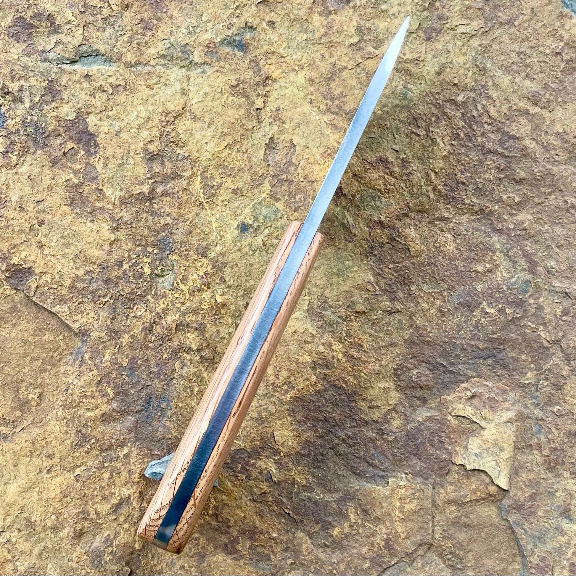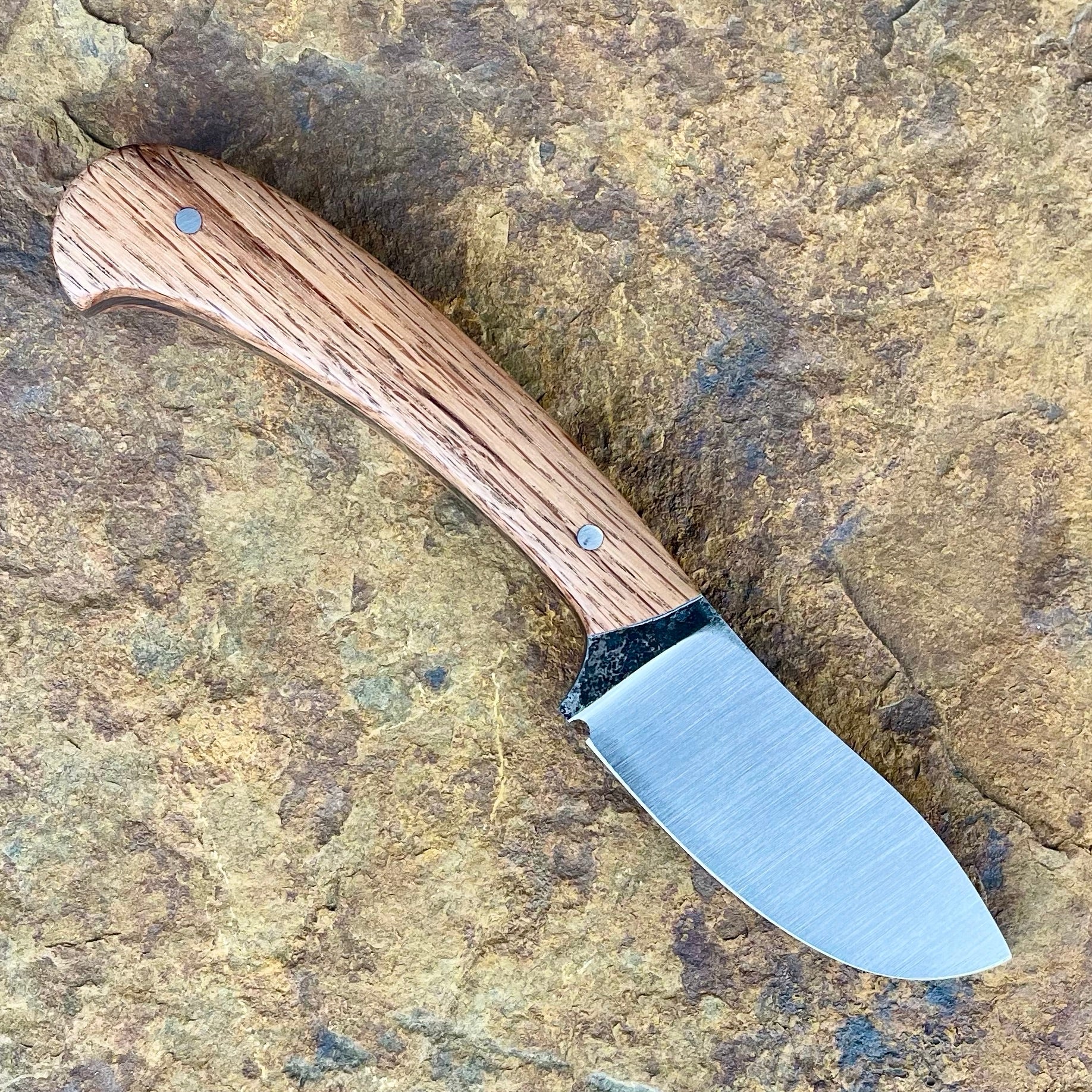 This Nessmuk is stock removal from 1080 high carbon steel with flat ground bevels and 3/16 inch thick full tang construction blade. The handle is 5/8 inch thick at the pommel and tapered to the front and contoured to fit the hand nicely. The handle is assembled with Natural Oak scales and two 1/8 inch pins. Full tang. 2 7/8 inch blade, 7 1/4 inches overall. 1080 high carbon. Stock removal.